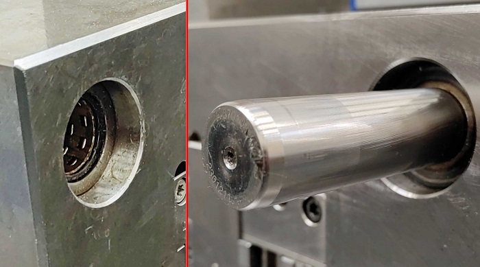 Pilar guia e gaiola de rolos do Agathon Guiding System Plus instalados num molde. (Foto: Klaus Vollrath)