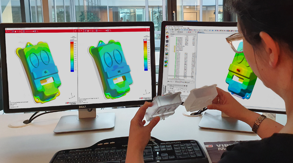 Outra atualização importante no nosso software é introdução do cálculo de projetos multicomponentes. Agora já é possível executar projetos multicomponente através do virtual Design of Experiments (DoE), a fim de os ajustar de forma mais precisa uns aos outros com as considerações dos parâmetros do seu processo de injeção, bem como ajudar no desenvolvimento de peças multicomponentes, incluindo moldes aliados ao processo com a ajuda de Molding Virtual. Temos no nosso stand um exemplo já apresentado na feira K 2019, o suporte de telemóvel "Butterfly", da empresa ELMET.