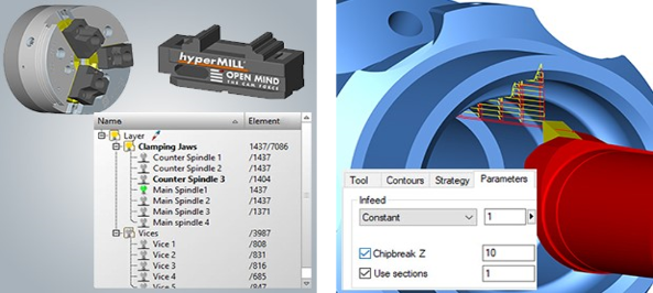 O hyperMILL agora oferece a opção de programar convenientemente as operações de maquinação em ambos os lados da máquina *com fuso principal e contra fuso.