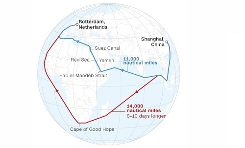 Desde as sanções impostas pela União Europeia à Rússia, pela guerra com a Ucrânia, a Europa virou-se para o Médio Oriente para importação de petróleo, através do Canal do Suez. Um desvio resultante das perturbações no Mar Vermelho poderia levar a um aumento de 58 % a 129 % do tempo que os petroleiros demoram normalmente a percorrer as principais rotas mundiais, incluindo da Índia para a Europa e do Médio Oriente para a Europa.